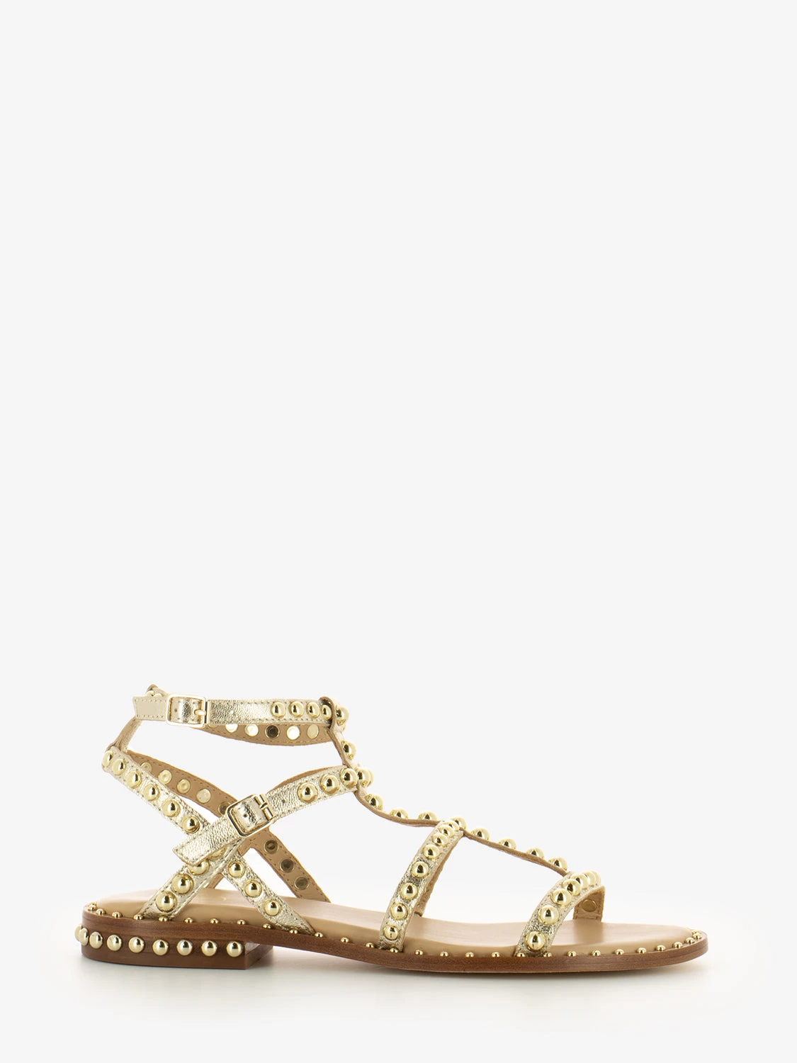 Borchie oro applicate su tomaia, bordo pianta e tacco.