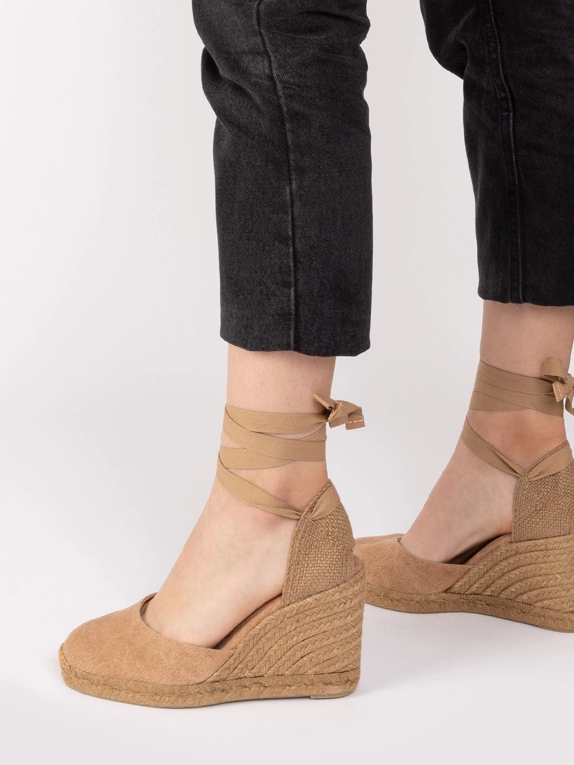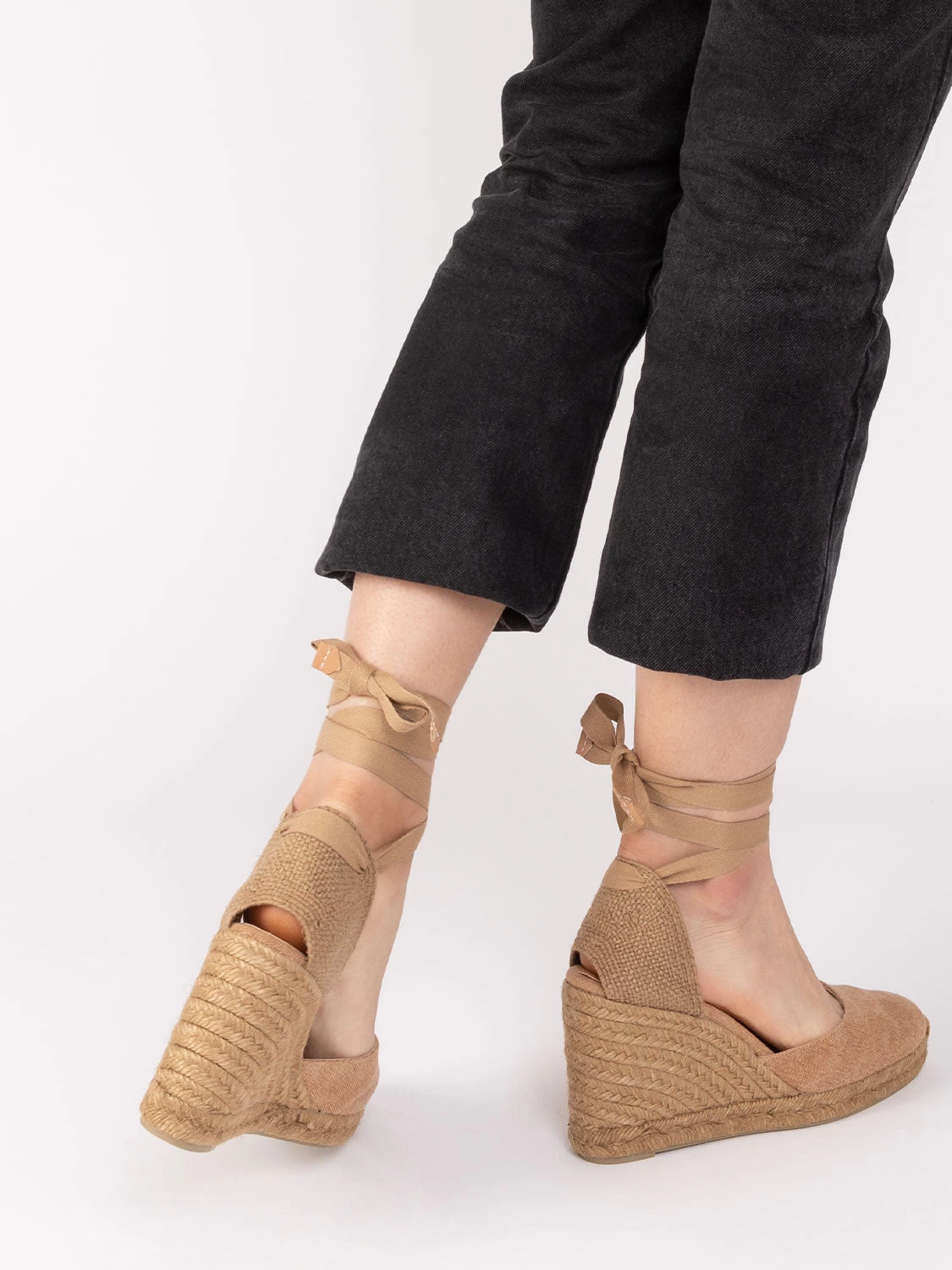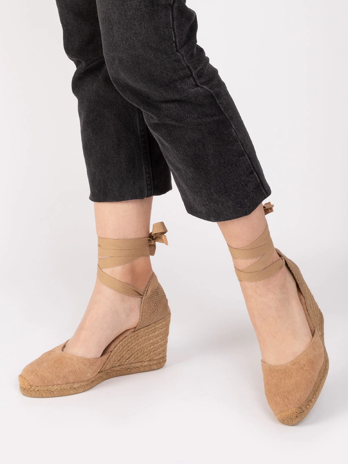 Tallone e punta chiusi con fettuccia annodabile alla caviglia.