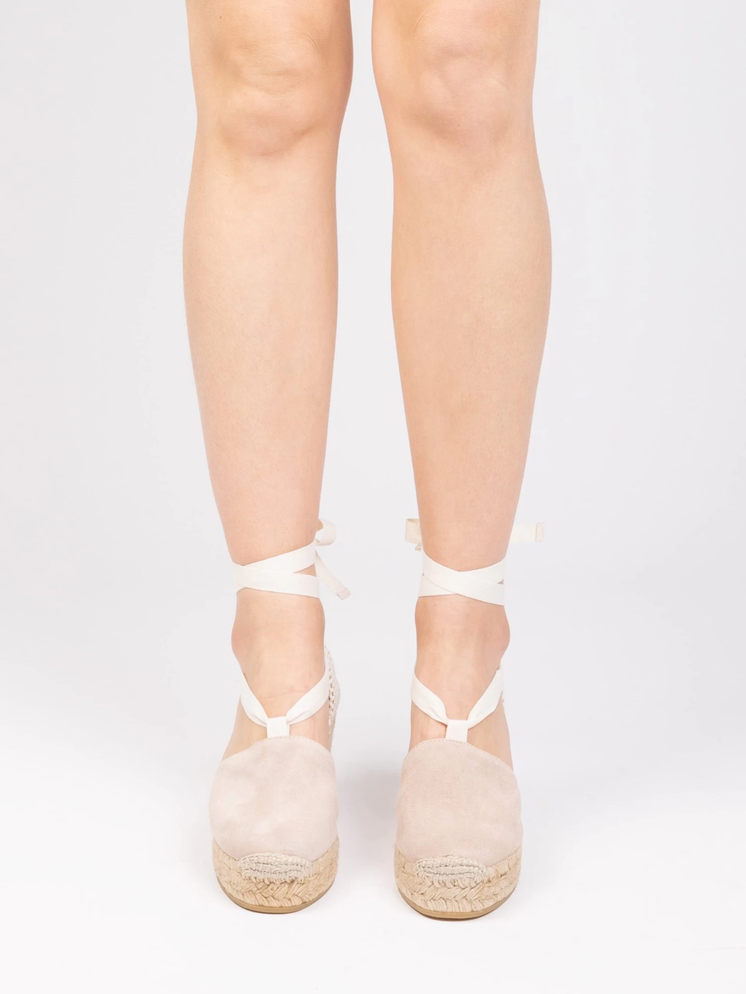 Punta chiusa in suede, tallone chiuso in filato e corda.