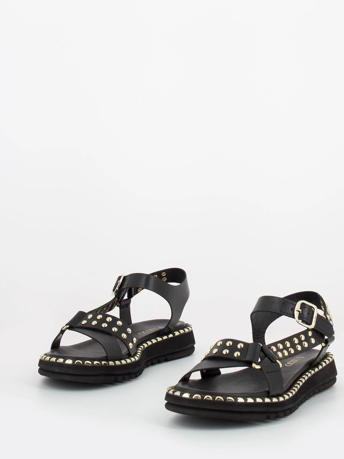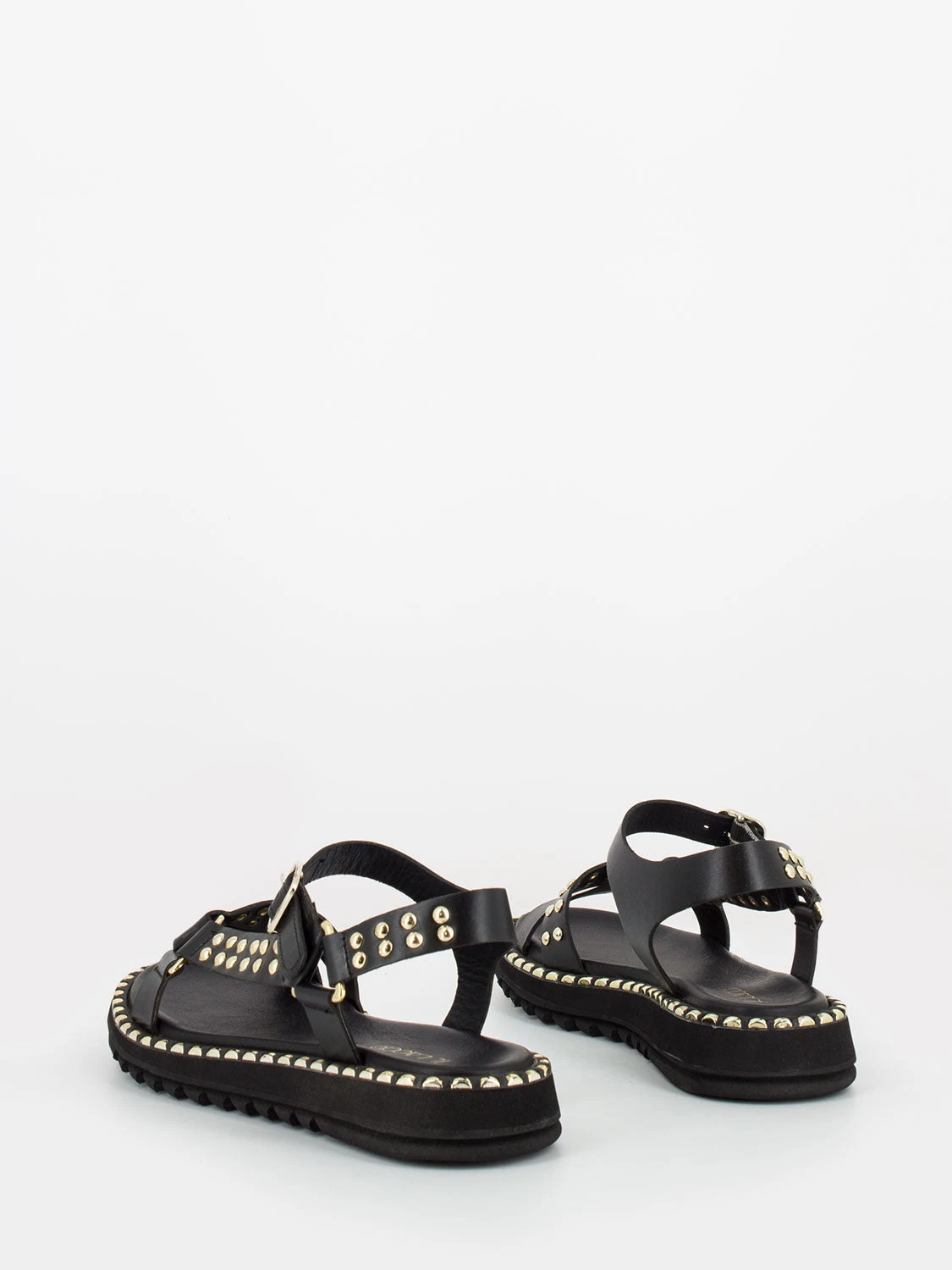 Borchie dorate tonde applicate su fasce e sul bordo del fondo.