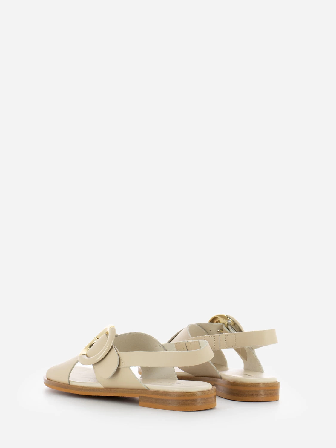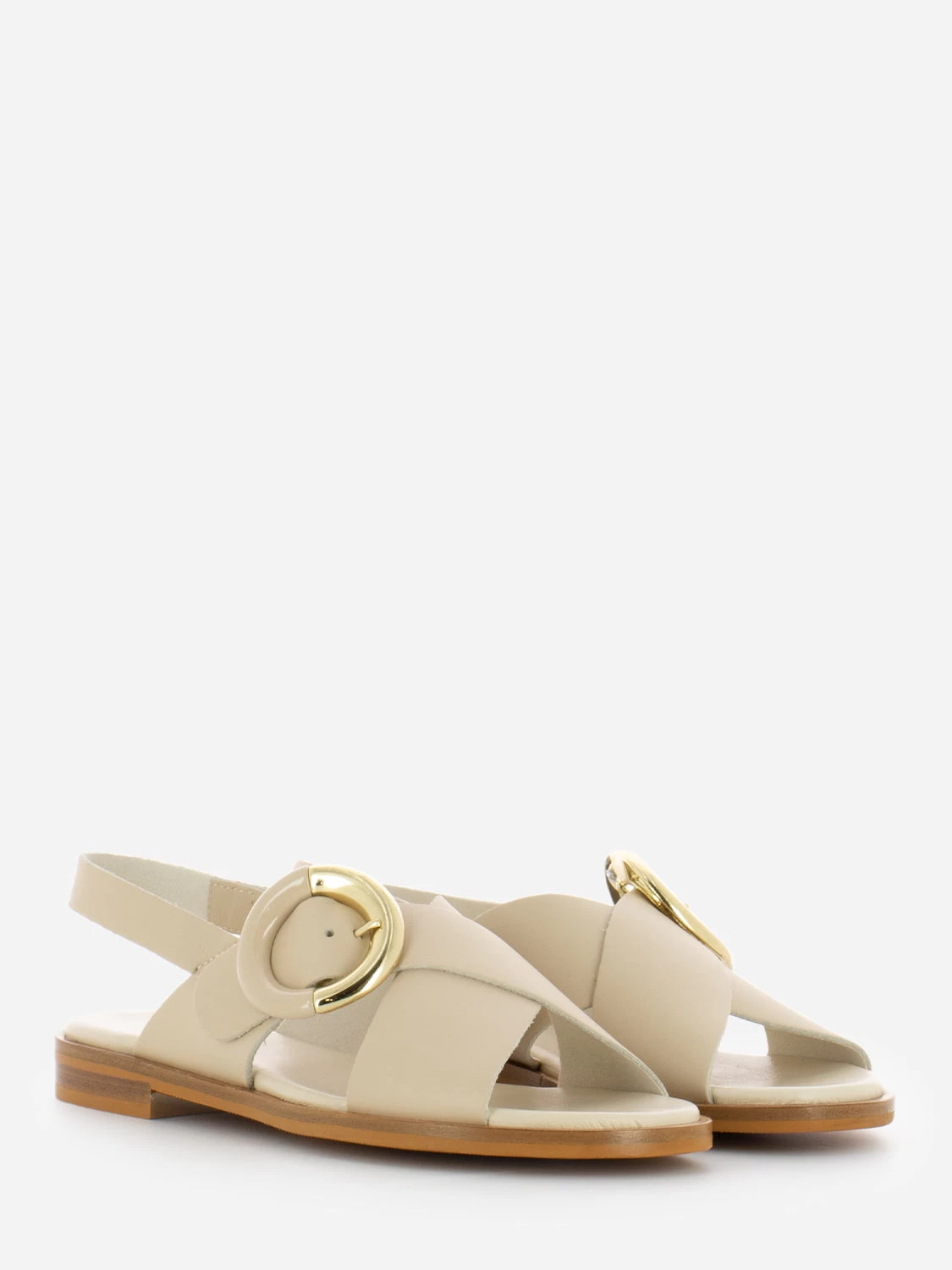 Fasce incrociate con maxi fibbia dorata e laccata tono su tono.