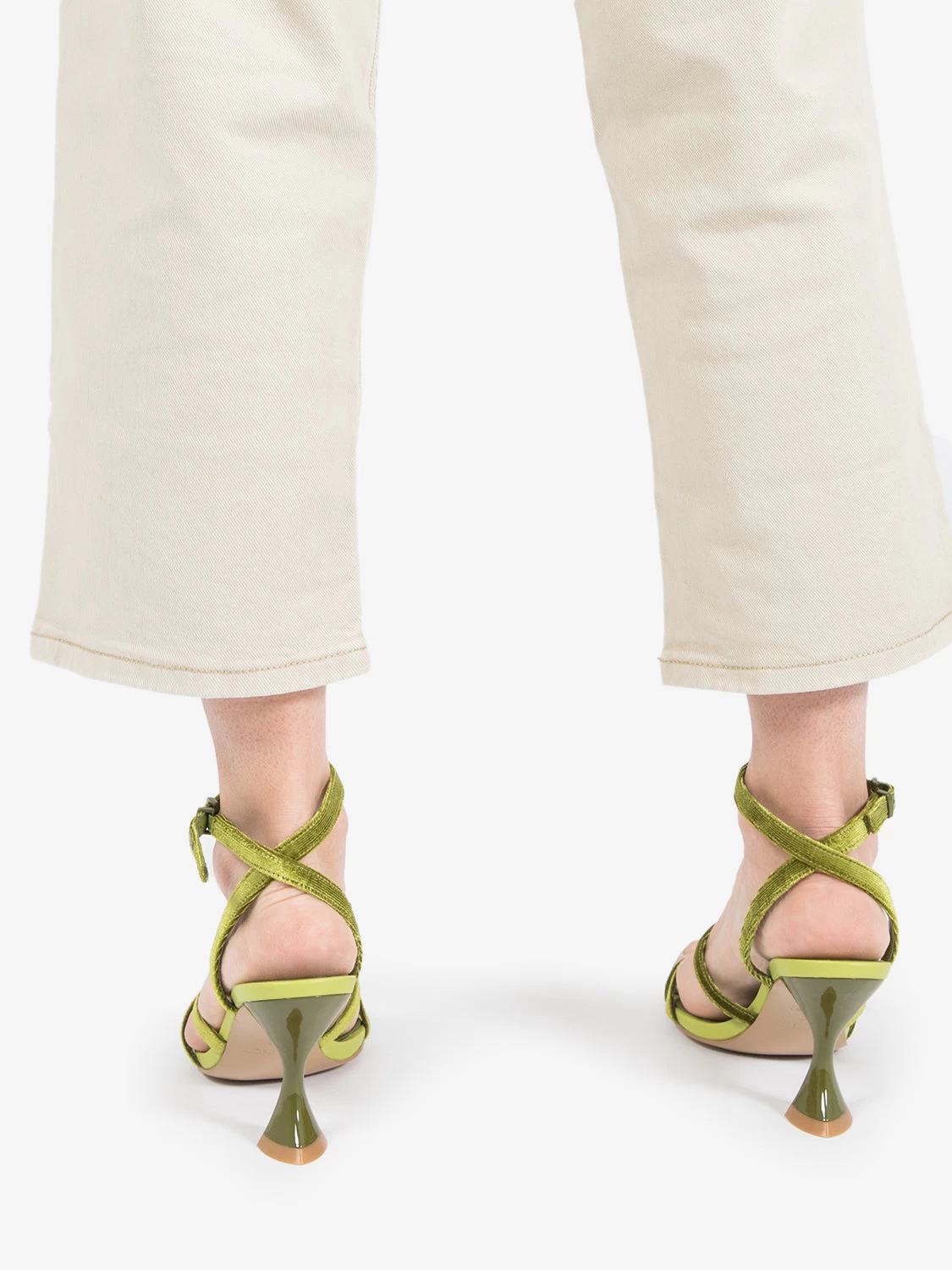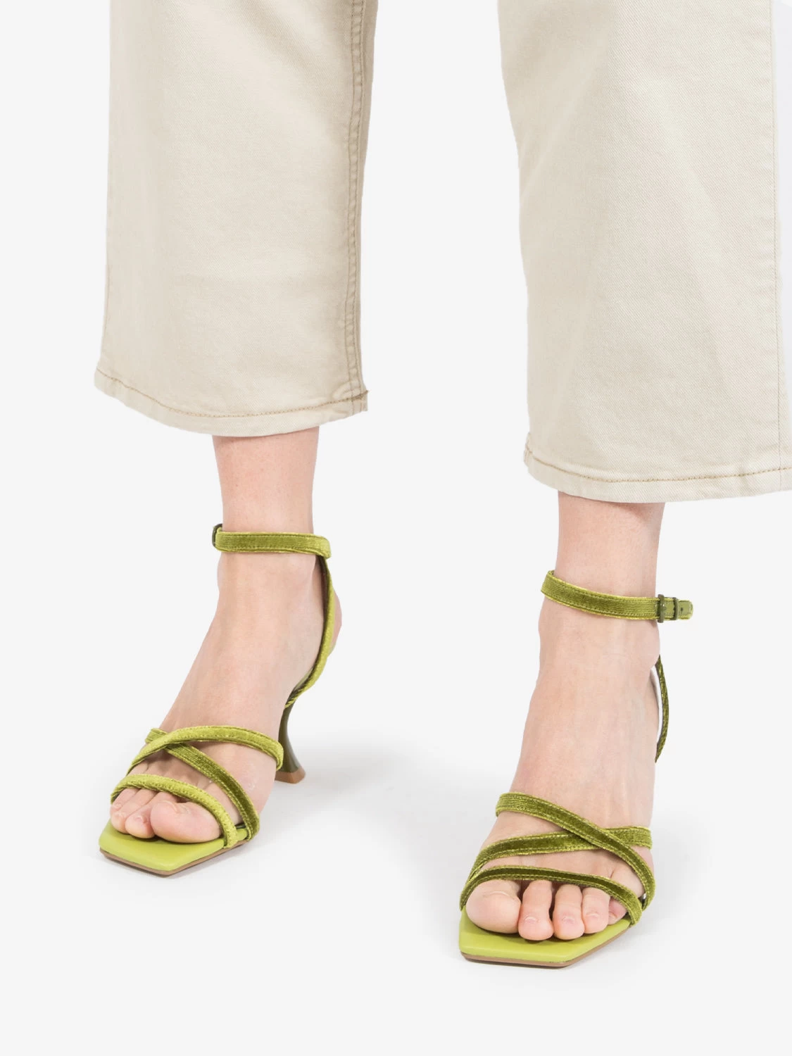 Fasce sottili in velluto, intrecciate sulla punta e sulla caviglia.